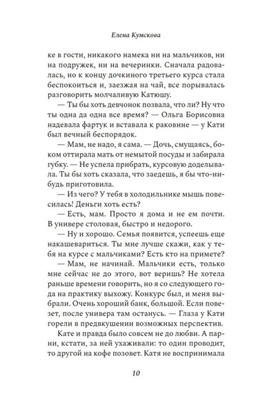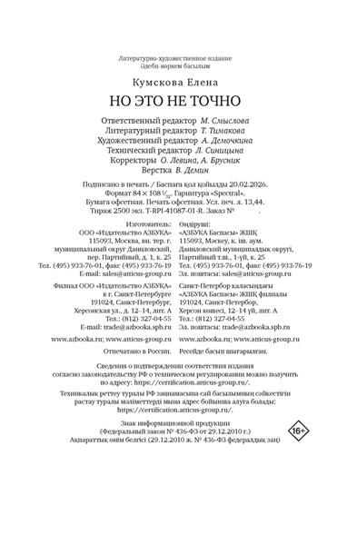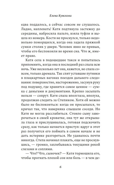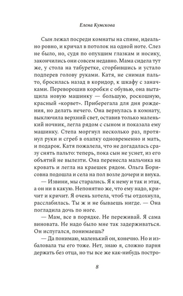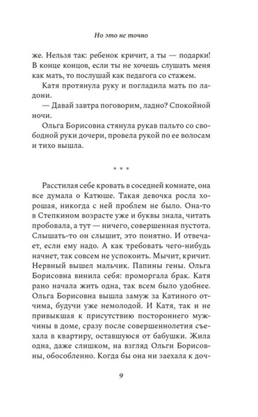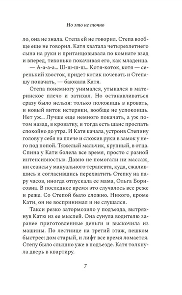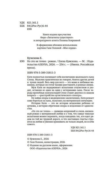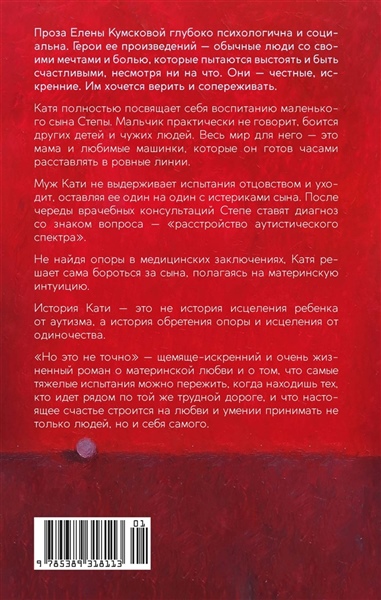 «Хорошая литература всегда работает со сложными темами, позволяя читателям прокачивать свою эмпатию, но делает это по-разному: одни книги оставляют после себя вопросы и размышления, другие — надежду и расширение наших жизненных горизонтов. Книга Елены Кумсковой — второго типа: ее герои учатся принимать других и себя, и это умение явно пригодится каждому из нас».Полина Бояркина Катя полностью посвящает себя воспитанию маленького сына Степы. Мальчик практически не говорит, боится других детей и чужих людей. Весь мир для него — это мама и любимые машинки, которые он готов часами расставлять в ровные линии. Муж Кати не выдерживает испытания отцовством и уходит, оставляя ее один на один с истериками сына. После череды врачебных консультаций Степе ставят диагноз со знаком вопроса — «расстройство аутистического спектра». Не найдя опоры в медицинских заключениях, Катя решает сама бороться за сына, полагаясь на материнскую интуицию. История Кати — это не история исцеления ребенка от аутизма, а история обретения опоры и исцеления от одиночества. «Но это не точно» — щемяще-искренний и очень жизненный роман о материнской любви и о том, что самые тяжелые испытания можно пережить, когда находишь тех, кто идет рядом по той же трудной дороге, и что настоящее счастье строится на любви и умении принимать не только людей, но и себя самого.
