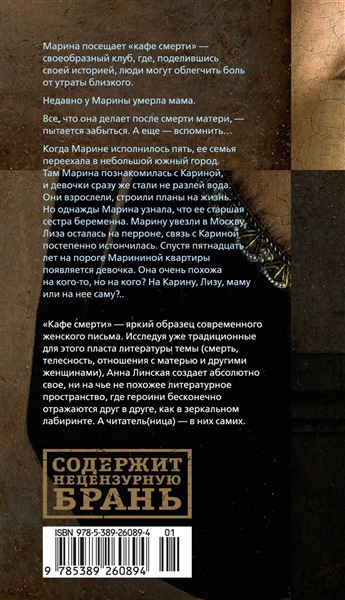 Марина посещает «кафе смерти» — своеобразный клуб, где, поделившись своей историей и мыслями, люди могут облегчить боль от утраты близкого. Недавно у Марины умерла мама. В прошлом она отказалась от своих амбиций, ушла из университета, где собиралась писать диссертацию. Поняв, что без работы долго не продержится, Марина устроилась в школу лаборанткой. Работа позволяет ей забыться. Все, что она делает после смерти матери, — пытается забыться. А еще — вспомнить… Когда Марине исполнилось пять, ее семья переехала в небольшой южный город. Там Марина познакомилась с Кариной, и девочки сразу же стали не разлей вода. Даже матери звали их обеих «Маринка-Каринка», а Лиза, старшая сестра Марины, ужасно ревновала ее к новой подруге. Школа, прогулки в лес, на пути к которому нужно миновать дом соседки-ведьмы бабы Нино; нестрашные детские тайны. Девочки взрослели, строили планы на жизнь, а тайны становились все более роковыми: однажды Марина узнала, что ее старшая сестра беременна. Марину увезли в Москву, Лиза осталась на перроне, связь с Кариной постепенно истончилась. Спустя пятнадцать лет на пороге Марининой квартиры появляется девочка. Она очень похожа на кого-то, но на кого? На Карину, Лизу, маму или на нее саму?.. «Кафе смерти» — яркий образец современного женского письма. Исследуя уже традиционные для этого пласта литературы темы (смерть, телесность, отношения с матерью и другими женщинами), Анна Линская создает абсолютно свое, ни на чье не похожее литературное пространство, где героини бесконечно отражаются друг в друге, как в зеркальном лабиринте. А читатель(ница) — в них самих. Анна Линская — выпускница магистерской программы «Литературное мастерство» НИУ ВШЭ. Публиковалась в сборниках и журналах «Пашня-4», The Manifest-Station, «Юность», Autovirus. Преподает в Creative Writing School.