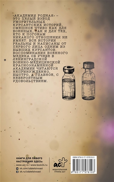 "Академия родная" — это целый взвод уморительных курсантских историй, смешное чтиво как для военных, так и для тех, кто к погонам никакого отношения не имеет. Все истории реальны и написаны от первого лица одним из бывших курсантов. Воспоминания военного медика об учебе в ленинградской Военно-медицинской ордена Ленина Краснознаменной академии им. С. М. Кирова читаются непринужденно, быстро, а главное — с невероятным удовольствием.