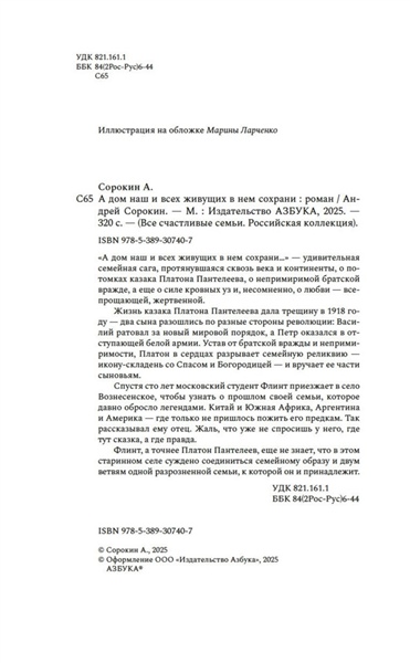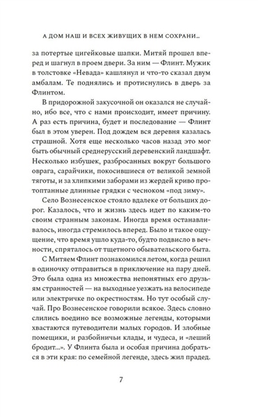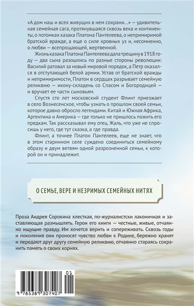 Жизнь казака Платона Пантелеева дала трещину в 1918 году: два сына разошлись по разные стороны революции: Василий ратовал за новый мировой порядок, а Петр оказался в отступающей Белой армии. Устав от братской вражды и непримиримости, Платон в сердцах разрывает семейную реликвию — икону-складень со Спасом и Богородицей, и вручает ее части сыновьям. Спустя сто лет московский студент Флинт приезжает в село Вознесенское, чтобы узнать о прошлом своей семьи, которое давно обросло легендами. Китай и Южная Африка, Аргентина и Америка – где только не пришлось пожить его предкам. Так рассказывал ему отец. Жаль, что уже не спросишь у него, где тут сказка, а где правда. Флинт, а точнее – Платон Пантелеев, еще не знает, что в этом старинном селе суждено соединиться семейному образу и двум ветвям одной разрозненной семьи, к которой он и принадлежит. «А дом наш и всех живущих в нем сохрани…» — удивительная семейная сага, протянувшаяся сквозь века и континенты, о потомках казака Платона Пантелеева, о непримиримой братской вражде, а еще о силе кровных уз и, несомненно, о любви — всепрощающей, жертвенной.