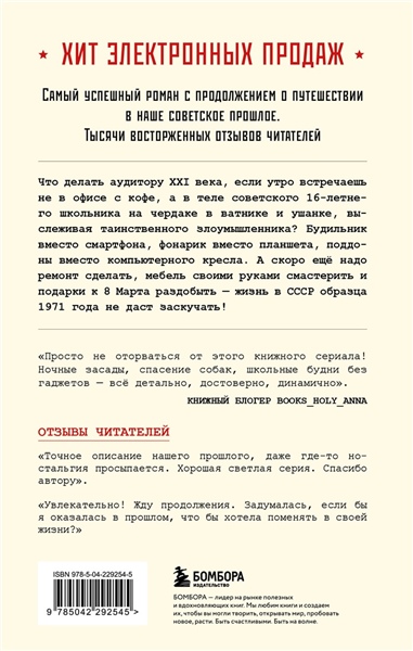 Хит электронных продаж. Самый успешный роман с продолжением о путешествии в наше советское прошлое. Сотни тысяч восторженных отзывов от читателей Литрес! Что делать аудитору XXI века, если утро встречаешь не в офисе с кофе, а в теле 16-летнего советского школьника, на чердаке, в ватнике и ушанке, выслеживая таинственного злоумышленника? Будильник вместо смартфона, фонарик вместо планшета, поддоны вместо компьютерного кресла. А впереди еще ремонт сделать, мебель своими руками смастерить и подарки к 8 Марта раздобыть — жизнь в СССР образца 1971 года не даст заскучать! «Просто не оторваться от этого книжного сериала с приключениями обычного советского школьника, которым неожиданно стал аудитор из нашего времени. Ночные засады, спасение собак, школьные будни без гаджетов — всё детально, достоверно, динамично». — Книжный блогер books_holy_anna Отзывы читателей «Наконец вышла текстовая версия, а то пришлось взять аудиокнигу (настолько захватил сюжет!). Точное описание нашего прошлого, даже где-то ностальгия просыпается. Хорошая светлая серия. Спасибо автору». «Увлекательно! Жду продолжения. Задумалась, если бы я оказалась в прошлом, что бы хотела поменять в своей жизни…»