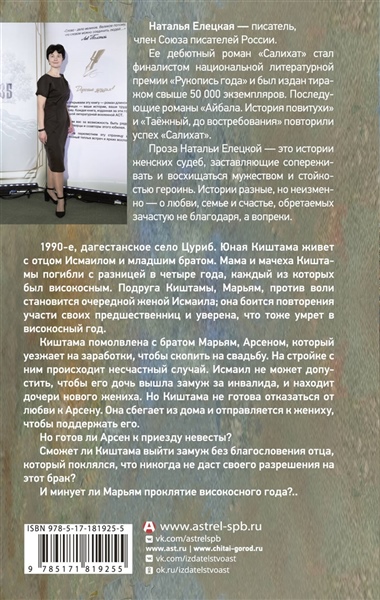 Дебютный роман Натальи Елецкой "Салихат" стал финалистом Национальной литературной премии "Рукопись года" и был издан тиражом свыше 50 000 экземпляров. Последующие романы "Айбала. История повитухи" и "Таёжный, до востребования" повторили успех "Салихат". В новом романе "Киштама" автор снова обращается к темам, затронутым в книгах "Салихат" и "Айбала", и рассказывает историю женщины, которая вынуждена делать непростой выбор между традициями своего рода и собственными чувствами. 1990-е, дагестанское село Цуриб. Юная Киштама живет с отцом Исмаилом и младшим братом. Мама и мачеха Киштамы погибли с разницей в четыре года, каждый из которых был високосным. Подруга Киштамы, Марьям, против воли становится очередной женой Исмаила; она боится повторения участи своих предшественниц и уверена, что тоже умрет в високосный год. Киштама помолвлена с братом Марьям, Арсеном, который уезжает на заработки, чтобы скопить на свадьбу. На стройке с ним происходит несчастный случай — он лишается руки. Исмаил не может допустить, чтобы его дочь вышла замуж за инвалида, и находит дочери нового жениха. Но Киштама не готова отказаться от любви к Арсену. Она сбегает из дома и отправляется к жениху, чтобы поддержать его. Но готов ли Арсен к приезду невесты? Сможет ли Киштама выйти замуж без благословения отца, который поклялся, что никогда не даст своего разрешения на этот брак? И минует ли Марьям проклятие високосного года?..