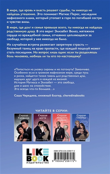В мире, где кровь и власть решают судьбы, ты никогда не найдешь утешение. Это понимает Матиас Перес, наследник мафиозного клана, который утопает в горе по погибшей сестре и чувстве вины. В мире, где долг и семья превыше все, ты никогда не найдешь родственную душу. В это верит Элизабет Велез, мятежная сирена из враждебной семьи, отчаянно цепляющаяся за свободу, которой у нее никогда не было. Их случайная встреча разжигает запретную страсть — безумный танец на краю пропасти, где каждый поцелуй может стать последним. Но вопрос лишь один: если ты разделяешь боль человека, любишь ли ты его по-настоящему?