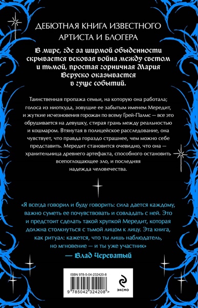 ДЕБЮТНАЯ КНИГА ИЗВЕСТНОГО АРТИСТА И БЛОГЕРА. В мире, где за ширмой обыденности скрывается вековая война между светом и тьмой, простая горничная Мария Веруско оказывается в гуще событий. Таинственная пропажа семьи, на которую она работала; голоса из ниоткуда, зовущие ее забытым именем Мередит, и жуткие исчезновения горожан по всему Грей-Палмс — все это обрушивается на девушку, стирая грань между реальностью и кошмаром. Втянутая в полицейское расследование, она чувствует, что правда гораздо страшнее, чем можно себе представить. Мередит становится очевидно, что она — хранительница древнего артефакта, способного остановить всепоглощающее зло, и последняя надежда человечества. «Я всегда говорил и буду говорить: сила дается каждому, важно суметь ее почувствовать и совладать с ней. Это и предстоит сделать такой хрупкой Мередит, которая должна столкнуться с Тьмой лицом к лицу. Эта книга как ритуал: кажется, что ты лишь наблюдатель, но мгновение — и ты уже участник». — Влад Череватый «Идеально: мистика, секреты, тайны! Крутой дебют!» — Дима Масленников
