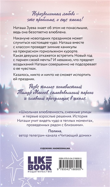 САМЫЙ ЗНАМЕНИТЫЙ ЗИМНИЙ РОМАН «ЗАГАДАЙ ЛЮБОВЬ» АСИ ЛАВРИНОВИЧ В АЛЬТЕРНАТИВНОМ ОФОРМЛЕНИИ. Теперь в новом стильном оформлении с иллюстрацией на обложке от потрясающей MadnessMalina. Неразделенная любовь — это проблема, и еще какая! Наташа Зуева знает об этом не понаслышке, ведь она безответно влюблена. Накануне новогодних праздников может случиться настоящее чудо. Наташа вместе с классом проведет зимние каникулы на прекрасном горнолыжном курорте. Какая девушка откажется встретить Новый год с парнем своей мечты? И неважно, что предмет воздыханий Наташи совершенно не подозревает о ее чувствах. Казалось, никто и ничто не сможет испортить ей праздник. Разве только ненавистный Тимур Макеев, самодовольный парень и главный прогульщик в школе. О КНИГЕ • Переиздание новогодней новинки от Аси Лавринович. • На обложке иллюстрация от талантливой художницы MadnessMalina. • Создает идеальное новогоднее настроение и дарит положительные эмоции. • Экранизация онлайн-кинотеатра Okko! В одноименном сериале снялись звезды российского кино: Татьяна Васильева, Мария Миронова, Максим Лагашкин, Сергей Епишев и многие другие. А заглавную песню исполнил сам Сергей Лазарев! ОБ АВТОРЕ Ася Лавринович — один из самых популярных авторов российского янг эдалта в жанре современной сентиментальной прозы. Суммарный тираж ее проданных книг составляет более 1,6 млн экземпляров. Победитель премии «Выбор читателей 2023» на Livelib в номинации «Young Adult. Лучшая книга о подростках и для подростков». На две книги Аси — «Загадай любовь» и «Нелюбовь сероглазого короля» — куплены права на экранизацию от ОККО.