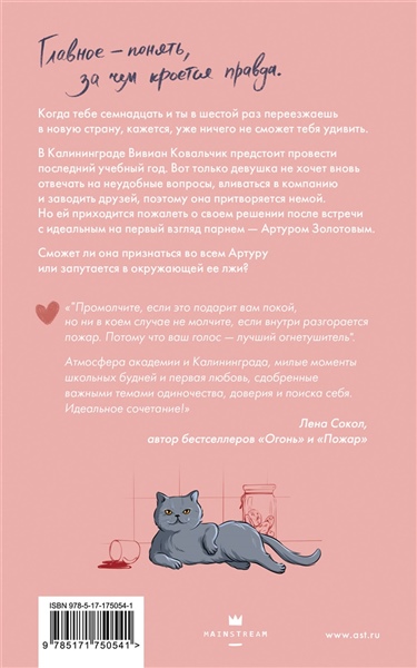 Когда тебе семнадцать, и ты в шестой раз переезжаешь в новую страну, кажется, уже ничего не сможет тебя удивить. В Калининграде Вивиан Ковальчик предстоит провести последний учебный год. Вот только девушка не хочет вновь отвечать на неудобные вопросы, вливаться в компанию и заводить друзей, поэтому она притворяется немой. Но ей приходится пожалеть о своем решении после встречи с идеальным на первый взгляд парнем — Артуром Золотовым. Сможет ли она признаться во всем Артуру или запутается в окружающей ее лжи?
