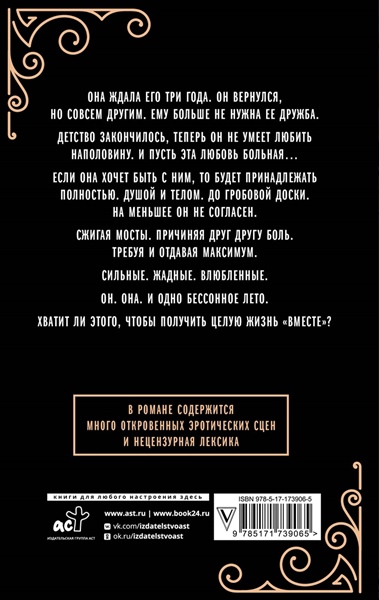 Она ждала его три года. Он вернулся, но совсем другим. Ему больше не нужна ее дружба. Детство закончилось, теперь он не умеет любить наполовину. И пусть эта любовь больная… Если она хочет быть с ним, то будет принадлежать полностью. Душой и телом. До гробовой доски. На меньшее он не согласен. Сжигая мосты. Причиняя друг другу боль. Требуя и отдавая максимум. Сильные. Жадные. Влюбленные. Он. Она. И одно бессонное лето. Хватит ли этого, чтобы получить целую жизнь "вместе"?
