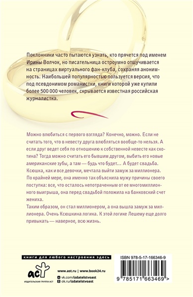 Можно влюбиться с первого взгляда? Конечно, можно. Если не считать того, что в невесту друга влюбляться вообще-то нельзя. А если друг ведет себя по отношению к собственной невесте как скотина? Тогда можно считать его бывшим другом, выбить его новые американские зубы, а там — будь что будет… А будет свадьба. Ксюшка, как и все девочки, мечтала выйти замуж за миллионера. По крайней мере, она именно так объяснила мужу причины своего поступка: все, что осталось непотраченным от ее многомиллионного выигрыша, она перед свадьбой положила на банковский счет жениха. Таким образом, он стал миллионером, а она вышла замуж за миллионера. Очень Ксюшкина логика. К этой логике Лешему еще долго привыкать — наверное, всю жизнь.