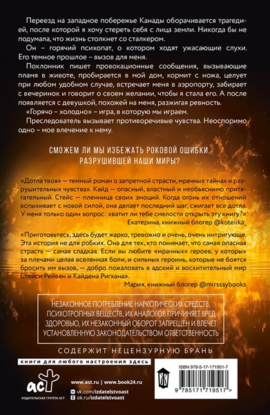 Переезд на западное побережье Канады оборачивается трагедией, после которой я хочу стереть себя с лица земли. Никогда бы не подумала, что жизнь столкнет со сталкером. Он - горячий психопат, о котором ходят ужасающие слухи. Его темное прошлое - вызов для меня. Поклонник пишет провокационные сообщения, вызывающие пламя в животе, пробирается в мой дом, кормит с ножа, целует при любом удобном случае, встречает меня в аэропорту, забирает с вечеринок и говорит о своем желании, чтобы я стала его. А после появляется с девушкой, похожей на меня, разжигая ревность. "Горячо-холодно" - игра, в которую мы играем. Преследователь вызывает противоречивые чувства. Неоспоримо одно - моё влечение к нему. Сможем ли мы избежать роковой ошибки, разрушившей наши миры?