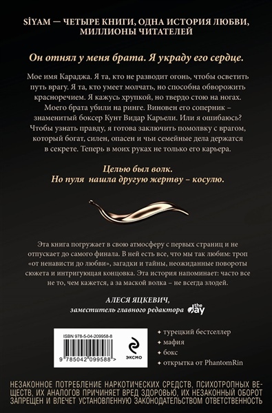 DARK ROMANCE С ДУШОЙ СТАМБУЛА. НАЧАЛО НОВОГО КНИЖНОГО СЕРИАЛА ТОПОВОГО ТУРЕЦКОГО АВТОРА. ИСТОРИЯ В РИТМЕ «ЧЕРНО-БЕЛОЙ ЛЮБВИ», КОГДА СТРАСТЬ ОПАСНЕЕ ПУЛИ. Он приручил волка. Сможет ли приручить ее ненависть? Стамбул прячет кровь и секреты под снегом. Этот город — идеальная клетка для двоих, чьи судьбы связаны тайной и виной. Кунт — чемпион боксерского ринга, Караджа — сестра его жертвы. Чтобы узнать правду и наказать виновных, Карадже придется заключить сделку с врагом — мужчиной, чьи золотые глаза опаснее дикого зверя. Их хрупкий союз — игра на выживание, где ставки выше, чем жизнь. «Эта книга погружает в свою атмосферу с первых страниц и не отпускает до самого финала. В ней есть все, что мы так любим: троп «от ненависти до любви», загадки и тайны, неожиданные повороты сюжета и интригующая концовка. Эта история напоминает: часто все не то, чем кажется, а за маской волка — не всегда злодей». — Алеся Яцкевич, заместитель главного редактора theDay Фирменный покет с клапанами и кремовой бумагой. Сияющая металлизированная фольга и тиснение на обложке. Подарочная открытка c главными героями от PhantomRin только в первом тираже. Для поклонников романов Луны Мейсон, Анны Тодд и турецких сериалов «Черно-белая любовь» и «Кольцо».