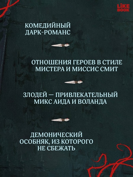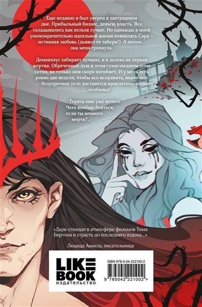 Это не похожий ни на что роман от одного из популярных авторов дарка — Софи Баунт, написанный на стыке жанров фэнтези и дарк-романса. Великолепное чтение на Хэллоуин! Безумное путешествие в готический особняк Демонхаус, в котором царит атмосфера «Семейки Аддамс», «Американской истории ужасов» и фильмов Тима Бертона. Что ждет на страницах книги? - Отношения парочки в стиле Мистера и Миссис Смит. - Переосмысление мифа об Аиде и Персефоне в современном мире, где девушку спасает юморной Геракл. - Злодей — привлекательный микс Аида и Воланда. - Главный герой постоянно косячит (настолько, что умирает в самом начале книги). - ОН мечтает о СВОЕЙ убийце. Еще недавно я был уверен в завтрашнем дне. Прибыльный бизнес, деньги, власть. Все складывалось как нельзя лучше. Но однажды в моей умопомрачительно идеальной жизни появилась Сара — истинная любовь (дьявол ее забери!). А потом... она меня грохнула. Демонхаус забирает лучших, и я далеко не первая жертва. Обреченных душ в этом сумасшедшем доме сотни, но только моя скоро погибнет. И у меня есть ровно две недели, чтобы все исправить, иначе мое безупречное тело достанется проклятому хозяину особняка! Терять мне уже нечего. Чего вообще бояться, если ты немного мёртв?.. Основные тропы: - «от ненависти до любви»; - «герметичный триллер»; - «мистическая атмосфера»; - «серая мораль»; - «черный юмор»; - «обретенная семья». Иллюстрация на обложке от популярного молодежного художника ALES. Цветные форзацы, цветные вклейки и графичные черно-белые иллюстрации в блоке от LANCHEVA и Digital Wizards.