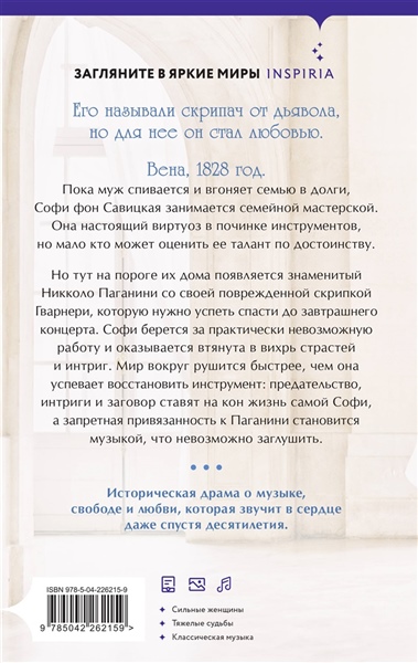 Пока на пороге их дома не появляется знаменитый Никколо Паганини со своей поврежденной скрипкой Гварнери, которую нужно успеть спасти до завтрашнего концерта. Софи берется за практически невозможную работу и оказывается втянута в вихрь страсти и интриг. Мир вокруг рушится быстрее, чем она успевает восстанавливать инструмент: предательство, интриги и заговор ставят на кон жизнь самой Софи, а запретная привязанность к Паганини становится музыкой, которую невозможно заглушить.