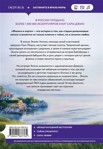 В жизни Эмили Уилсон, некогда самой удачливой девушки Нью-Йорка, наступает темная полоса. Творческий кризис, прохладные отношения с родными, а затем и измена мужа вынуждают Эмили уехать из мегаполиса и отправиться на остров Бейнбридж к своей двоюродной бабушке Би, в дом, рядом с которым растут дикие фиалки, а океан пенится прямо у крыльца. На острове Эмили знакомится с харизматичным Джеком, который рассказывает ей забавную историю о том, как ему не разрешали в детстве подходить слишком близко к ее дому. Но, кажется, Би не слишком довольна их знакомством... Эмили не получает от нее никаких объяснений, но вскоре находит датированный 1943 годом дневник некой Эстер Джонсон, чьи записи проливают свет на странное поведение местных жителей и меняют взглядЭмили на остров, который она обожала с самого детства. Сара Джио — одна из самых известных авторов романтической прозы. Ее знают и любят миллионы читателей в России. Роман «Фиалки в марте» — дебютная книга Сары Джио, которая принесла ей мировую известность.