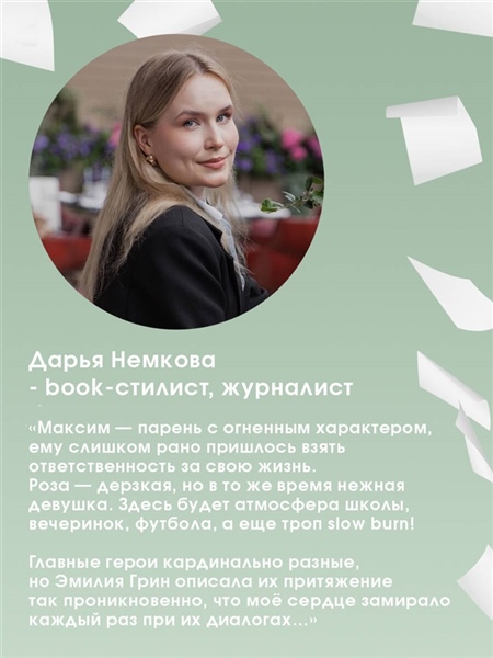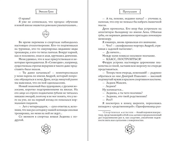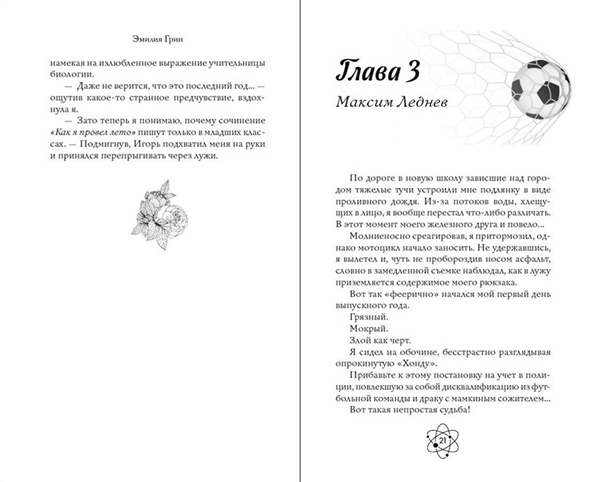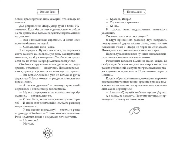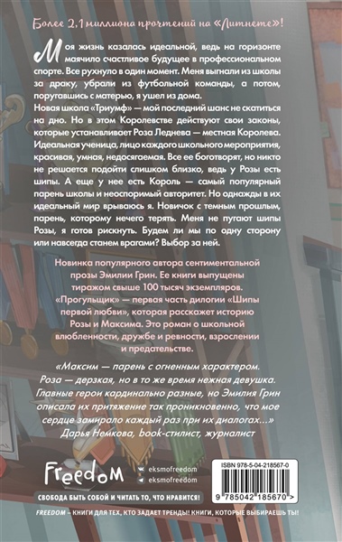 Новинка популярного автора сентиментальной прозы — Эмилии Грин. Ее книги выпущены тиражом свыше 100 тысяч экземпляров. «Прогульщик» — первая часть дилогии «Шипы первой любви», которая расскажет историю Розы и Максима. Роман моментально обрел популярность на портале Литнет, набрав более 2,1 миллиона прочтений, и вошел в топ «Подростковой прозы». Внутри атмосферная верстка, две сюжетных черно-белых иллюстрации, и только в первом тираже в подарок открытка! Моя жизнь казалась идеальной, ведь на горизонте маячило счастливое будущее в профессиональном спорте. Всё рухнуло в один момент. Меня выгнали из школы за драку, убрали из футбольной команды, а потом, поругавшись с матерью, я ушёл из дома. Новая школа «Триумф» — мой последний шанс не скатиться на дно. Но в этом Королевстве действуют свои законы, которые устанавливает Роза Леднёва — местная Королева. Идеальная ученица, лицо каждого школьного мероприятия, красивая, умная, недосягаемая. Все её боготворят, но никто не решается подойти слишком близко, ведь у Розы есть шипы. А ещё у неё есть Король — самый популярный парень школы и неоспоримый авторитет. Но однажды в их идеальный мир врываюсь я. Новичок с тёмным прошлым, парень, которому нечего терять. Меня не пугают шипы Розы, я готов рискнуть. Будем ли мы по одну сторону или навсегда станем врагами? Выбор за ней. Это история о первой школьной влюблённости, дружбе и ревности, взрослении и предательстве. Понравится поклонникам «Ворона» Эмилии Грин, «Пепла» Ники Сью, а также романа «Твое сердце будет разбито» и «По осколкам твоего сердца» Анны Джейн. Читайте книги автора! Дилогия «Шипы первой любви»: - «Прогульщик» Продолжение следует… Дилогия «На крыльях любви»: - «Ворон» - «Лебедь» Дилогия «На крыльях любви» (в подарочном оформлении) Одиночные истории: - «Хулиган» - «Леди и бродяга»