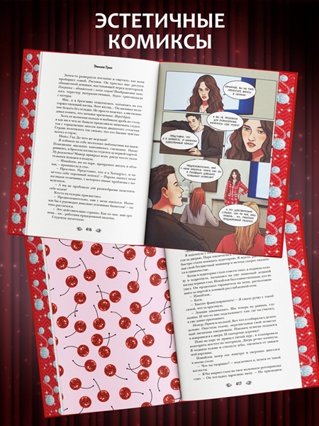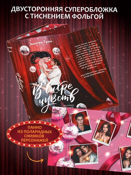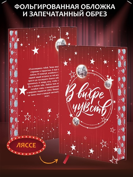 Внутри пять сюжетных иллюстраций и два мини-комикса, выполненные на мелованной бумаге. Эксклюзив — бонусная глава, которая еще нигде не публиковалась! Чтобы вам было удобно читать и останавливаться на любимых моментах, в книге есть бархатная ленточка ляссе, которая позволит не потерять нужную страничку! Под двусторонней суперобложкой скрывается сюрприз: одна сторона — это эффектный арт с героями на вечеринке, а другая — словно панно из стилизованных полароидных снимков любимых персонажей, которое можно снять и повесить на стену. Форзацы украшают изображения героев с их анкетами и переписками. На переплете использовано покрытие софт-тач, а звезды выполнены фольгой, которая переливается на свету! Яркий обрез украшает узор из звезд и диско-шаров. Это издание — лучший подарок поклонникам чувственных историй!