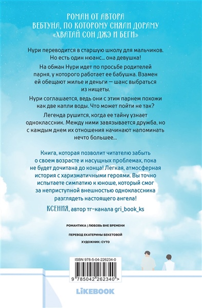 Роман от автора вебтуна, по которому сняли дораму «Хватай Сон Джэ и беги» («Lovely runner»). Романтическая комедия, первая любовь, школьные годы, девушка притворяется парнем. Нури переводится в старшую школу для мальчиков. Но есть один нюанс... она девушка! На обман Нури идет по просьбе родителей парня, у которого работает ее бабушка. Взамен ей обещают жилье и деньги — шанс выбраться из нищеты. Нури соглашается, ведь они с этим парнем похожи как две капли воды. Что может пойти не так? Легенда рушится, когда ее тайну узнает одноклассник. Между ними завязывается дружба, но с каждым днем их отношения начинают напоминать нечто большее… Тропы: «от вражды к дружбе», «первая любовь», «уютная повседневность», «корейская школа», «притворяясь парнем».