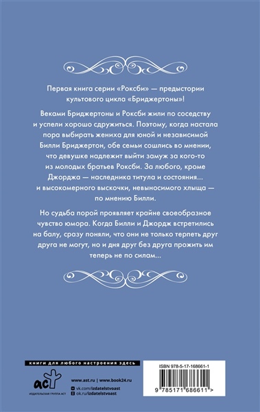 Первая книга серии "Роксби" — предыстории культового цикла "Бриджертоны"! Веками Бриджертоны и Роксби жили по соседству и успели хорошо сдружиться. Поэтому, когда настала пора выбирать жениха для юной и независимой Билли Бриджертон, обе семьи сошлись во мнении, что девушке надлежит выйти замуж за кого-то из молодых братьев Роксби. За любого, кроме Джорджа — наследника титула и состояния… и высокомерного выскочки, невыносимого хлыща — по мнению Билли. Но судьба порой проявляет крайне своеобразное чувство юмора. Когда Билли и Джордж встретились на балу, сразу поняли, что они не только терпеть друг друга не могут, но и дня друг без друга прожить им теперь не по силам…