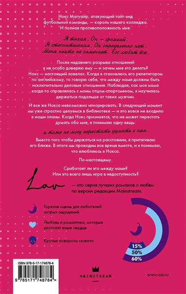 Нокс Магуайр, атакующий тайт-энд футбольной команды, — король нашего колледжа. И полная противоположность меня. Я тихая. Он — громкий. Я стеснительная. Он определенно нет. Меня никто не замечает. Его любят все. После недавнего разрыва отношений я не особо доверяю ему — и зачем мне это делать? Нокс — настоящий ловелас. Когда я становлюсь его репетитором по английскому, то говорю себе, что между нами должны быть исключительно деловые отношения. Наблюдая, как моя мама когда-то справлялась с моим отцом-спортсменом, я научилась держаться подальше от таких мужчин. И все же Нокса невозможно игнорировать. В следующий момент мы уже страстно целуемся в библиотеке — и это вовсе не входило в наши планы. Когда Нокс признается, что не может перестать думать обо мне, я понимаю одну вещь: Я тоже не могу перестать думать о нем. Вместо того чтобы держаться на расстоянии, я притягиваю его ближе. В итоге мы проводим все время вместе, и я понимаю, что влюбляюсь в Нокса. По-настоящему. Сработает ли это между нами? Или это всего лишь игра в недоступность?