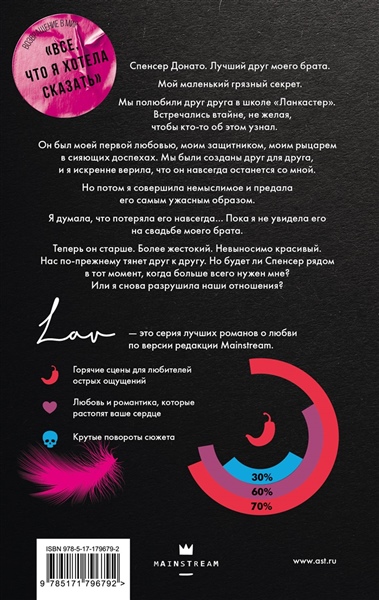 Спенсер Донато. Лучший друг моего брата. Мой маленький грязный секрет. Мы полюбили друг друга в школе "Ланкастер". Встречались втайне, не желая, чтобы кто-то об этом узнал. Он был моей первой любовью, моим защитником, моим рыцарем в сияющих доспехах. Мы были созданы друг для друга, и я искренне верила, что он навсегда останется со мной. Но потом я совершила немыслимое и предала его самым ужасным образом. Я думала, что потеряла его навсегда… Пока я не увидела его на свадьбе моего брата. Теперь он старше. Более жестокий. Невыносимо красивый. Нас по-прежнему тянет друг к другу. Но будет ли Спенсер рядом в тот момент, когда больше всего нужен мне? Или я снова разрушила наши отношения?