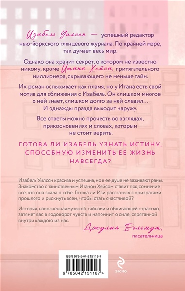 Она скрывала талант. Он скрывал правду. Изабель Уилсон — успешный редактор нью-йоркского глянцевого журнала. По крайней мере, так думает весь мир. Однако она хранит секрет, о котором неизвестно никому, кроме Итана Хейса, притягательного миллионера, скрывающего не меньше тайн. Их роман вспыхивает как пламя, но у Итана есть свой мотив для сближения с Изабель. Он слишком многое о ней знает, слишком долго за ней следил… и однажды правда выходит наружу. Все ответы можно прочесть во взглядах, прикосновениях и словах, которым не стоит верить. Готова ли Изабель узнать истину, способную изменить ее жизнь навсегда? Нездоровая привязанность, троп «он влюбляется первым» и «тронешь ее — тебе конец», горячие сцены 18+ и борьба с психическими расстройствами — все это встретится в романтической драме «Две жизни Изабель». «Изабель Уилсон красива и успешна, но в ее душе не заживают раны. Знакомство с таинственным Итаном Хейсом ставит под сомнение все, что она знала о себе. Готова ли Изи расстаться с призраками прошлого и рискнуть всем, чтобы стать счастливой? История, наполненная музыкой, тайнами и обжигающей страстью, затянет вас в водоворот чувств и напомнит о силе, спрятанной внутри каждого из нас». — Джулия Вольмут, писательница Для поклонников творчества Джулии Вольмут и Анны Джейн.