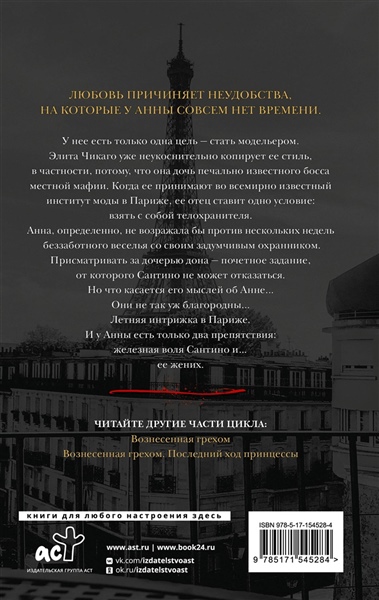 У нее есть только одна цель — стать модельером. Элита Чикаго уже неукоснительно копирует ее стиль, в частности, потому, что она дочь печально известного босса местной мафии. Когда ее принимают во всемирно известный институт моды в Париже, ее отец ставит одно условие: взять с собой телохранителя. Анна, определенно, не возражала бы против нескольких недель беззаботного веселья со своим задумчивым охранником. Присматривать за дочерью дона — почетное задание, от которого Сантино не может отказаться. Но что касается его мыслей об Анне... Они не так уж благородны... Летняя интрижка в Париже. И у Анны есть только два препятствия: железная воля Сантино и… ее жених.