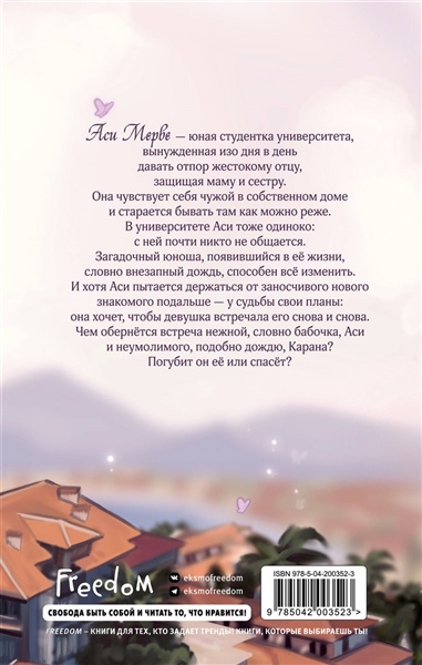 Загадочный юноша, появившейся в ее жизни, словно внезапный дождь, способен все изменить. И хотя Аси пытается держаться от заносчивого нового знакомого подальше — у судьбы свои планы: она хочет, чтобы девушка встречала его снова и снова. Чем обернется встреча нежной, словно бабочка, Аси и неумолимого, подобно дождю, Карана? Погубит он ее или спасет?