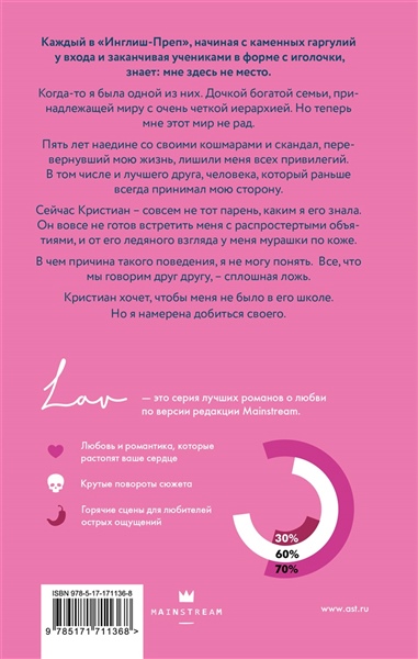 Каждый в "Инглиш-Преп", начиная с каменных гаргулий у входа и заканчивая учениками в форме с иголочки, знает: мне здесь не место. Когда-то я была одной из них. Дочкой богатой семьи, принадлежащей миру с очень четкой иерархией. Но теперь мне этот мир не рад. Пять лет наедине со своими кошмарами и скандал, перевернувший мою жизнь, лишили меня всех привилегий. В том числе и лучшего друга, человека, который раньше всегда принимал мою сторону. Сейчас Кристиан – совсем не тот парень, каким я его знала. Он вовсе не готов встретить меня с распростертыми объятиями, и от его ледяного взгляда у меня мурашки по коже. В чем причина такого поведения, я не могу понять. Все, что мы говорим друг другу, – сплошная ложь. Кристиан хочет, чтобы меня не было в его школе. Но я намерена добиться своего.