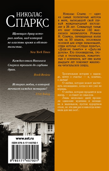 Трогательная история о надежде, мечте о счастье — и, конечно, о любви! О любви, которая может настигнуть неожиданно, когда в нее уже не веришь. О любви, которая продлится всю жизнь — и станет ее смыслом. Лишь несколько дней прожили одинокие мужчина и женщина в маленьком, пустом курортном отеле, но эти дни раз и навсегда изменили для них все!..