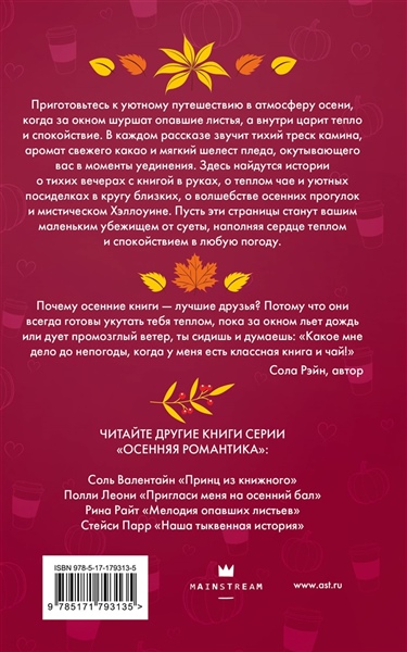 Приготовьтесь к уютному путешествию в атмосферу осени, когда за окном шуршат опавшие листья, а внутри царит тепло и спокойствие. В каждом рассказе звучит тихий треск камина, аромат свежего какао и мягкий шелест пледа, окутывающего вас в моменты уединения. Здесь найдутся истории о тихих вечерах с книгой в руках, о теплом чае и уютных посиделках в кругу близких, о волшебстве осенних прогулок и мистическом Хэллоуине. Пусть эти страницы станут вашим маленьким убежищем от суеты, наполняя сердце теплом и спокойствием в любую погоду.