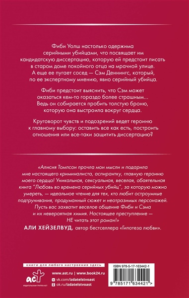 "Алисия Томпсон прочла мои мысли и подарила мне настоящего криминалиста, аспирантку, главную героиню моего сердца! Уникальная, сексуальная, веселая, обаятельная книга "Любовь во времена серийных убийц", за которую можно умереть, — идеальное чтение для тех, кто любит остроумные подтрунивания, продуманный сюжет и неотразимых персонажей. Пусть вас захватит веселое общение Фиби и Сэма и их невероятная химия. Настоящее преступление — НЕ читать этот роман!" — Али Хейзелвуд, автор бестселлера "Гипотеза любви". Фиби Уолш настолько одержима серийными убийцами, что посвящает им кандидатскую диссертацию, которую ей предстоит писать в старом доме покойного отца на мрачной улице. А еще ее пугает сосед — Сэм Деннингс, который, по ее экспертному мнению, явно серийный убийца. Фиби предстоит выяснить, что Сэм может оказаться кем-то гораздо более страшным… Ведь он собирается пробить толстую броню, которую она выстроила вокруг сердца. Круговорот чувств и подозрений ведет героиню к главному выбору: оставить все как есть, построить отношения или все-таки защитить диссертацию?