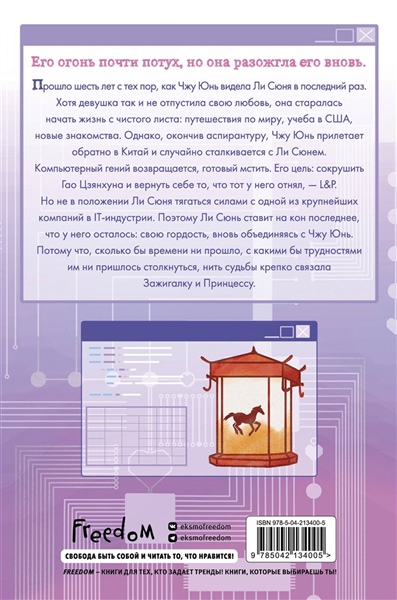 Второй том дилогии «Зажигалка и Принцесса» популярной китайской писательницы сентиментальной прозы Twentine про любовь программистки Чжу Юнь и гения программирования Ли Сюня. Шесть лет спустя. Расставшись с Ли Сюнем, Чжу Юнь старалась начать жизнь с чистого листа: путешествия по миру, учеба в США, новые знакомства, но так и не смогла отпустить свою первую любовь. Однако, окончив аспирантуру, девушка возвращается в Китай и случайно сталкивается с Ли Сюнем. Компьютерный гений стремится отомстить Гао Цзянхуна и вернуть себе то, что тот у него отнял — L&P. Поэтому Ли Сюнь вновь объединяется с Чжу Юнь. Потому что сколько бы времени ни прошло, с какими бы трудностями им ни пришлось столкнуться, нить судьбы крепко связала Зажигалку и Принцессу. Вас ждет уникальный макет, запечатанный форзац с чиби-персонажами, суперобложка, фольгированная обложка и разворотная иллюстрация. Новелла особенно придется по душе фанатам таких тропов, как «обретенная семья» и «второй шанс». По мотивам новеллы была выпущена дорама под названием «Заводила и принцесса».