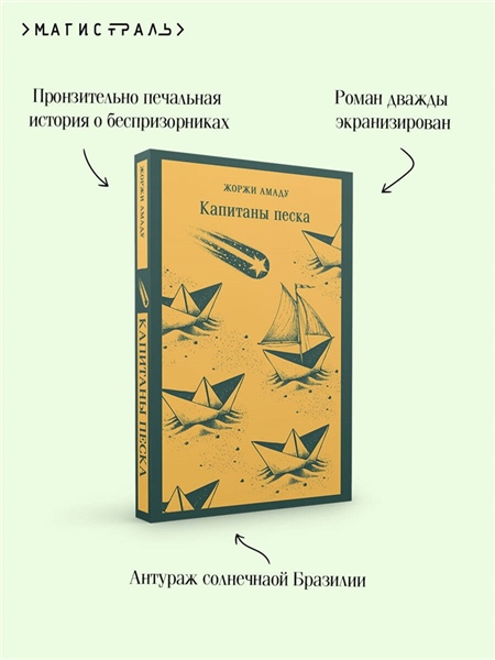 «Моя жангада уплывает вдаль, Судьба моя, ты так трудна...» Пронзительно печальная история о беспризорникахзагадочного бразильского города Салвадор да Баия.Кто они,«капитаны песка», которые держат в страхе весь город? Банда бездомных подростков от восьмидо шестнадцати лет, вынужденных скитаться, бродяжничать, пробиваться случайными заработками и воровать, грабить, чтобы выжить. «Капитаны песка не похожи на других детей… Они знают о жизни все, даже тайны любви… С самого детства они ведут жизнь взрослых мужчин».Они и жертвы социальной несправедливости, и они же — единственные по-настоящему свободные люди в мире. Во всех книгах Жоржи Амаду его родина — солнечная Бразилия, которую он нанес на карту мира, раскрасил яркими красками и оживил. Это море, капоэйра, веселье, карнавал, романтика... Автор любит своих героев, любит свою страну и ее людей. Роман дважды экранизирован, первый фильмамериканского режиссера Холла Бартлета «Генералы песчаных карьеров» ( 1971 г.)потрясает силой и красотой. А музыка к фильму затрагивает самые чуткие струны души и отзывается в сердце. Музыку сочинил друг Жоржи Амаду Доривал Каимми. Новая экранизация вышла в 2011 году — дебют Сесилии Амаду (внучки писателя).