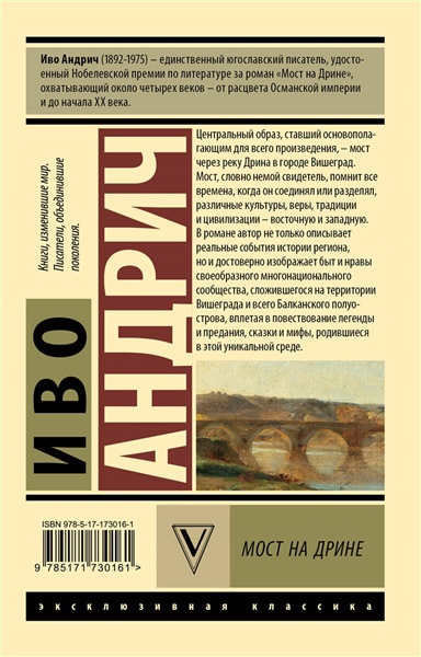 Иво Андрич (1892-1975) – единственный югославский писатель, удостоенный Нобелевской премии по литературе за роман "Мост на Дрине", охватывающий около четырех веков — от расцвета Османской империи и до начала XX века. Центральный образ, ставший основополагающим для всего произведения, — мост через реку Дрина в городе Вишеград. Мост, словно немой свидетель, помнит все времена, когда он соединял или разделял, различные культуры, веры, традиции и цивилизации – восточную и западную. В романе автор не только описывает реальные события истории региона, но и достоверно изображает быт и нравы своеобразного многонационального сообщества, сложившегося на территории Вишеграда и всего Балканского полуострова, вплетая в повествование легенды и предания, сказки и мифы, родившиеся в этой уникальной среде.