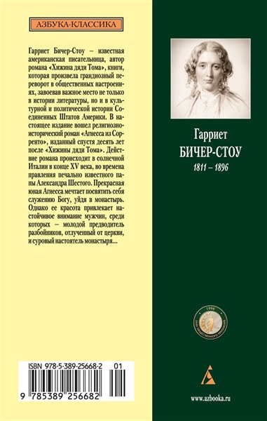 Гарриет Бичер-Стоу (1811–1896) — известная американская писательница, автор романа «Хижина дяди Тома», книги, которая произвела грандиозный переворот в общественных настроениях, завоевав важное место не только в истории литературы, но и в культурной и политической истории Соединенных Штатов Америки.В настоящее издание вошел религиозно-исторический роман «Агнесса из Сорренто», изданный спустя десять лет после «Хижины дяди Тома». Действие романа происходит в солнечной Италии в конце XV века, во времена правления печально известного папы Александра Шестого. Прекрасная юная Агнесса мечтает посвятить себя служению Богу, уйдя в монастырь. Однако ее красота привлекает настойчивое внимание мужчин, среди которых — молодой предводитель разбойников, отлученный от церкви, и суровый настоятель монастыря...