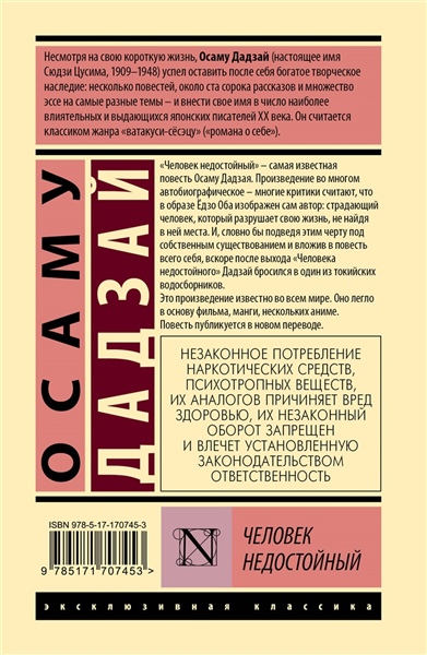 НЕЗАКОННОЕ ПОТРЕБЛЕНИЕ НАРКОТИЧЕСКИХ СРЕДСТВ, ПСИХОТРОПНЫХ ВЕЩЕСТВ, ИХ АНАЛОГОВ ПРИЧИНЯЕТ ВРЕД ЗДОРОВЬЮ, ИХ НЕЗАКОННЫЙ ОБОРОТ ЗАПРЕЩЕН И ВЛЕЧЕТ УСТАНОВЛЕННУЮ ЗАКОНОДАТЕЛЬСТВОМ ОТВЕТСТВЕННОСТЬ. "Человек недостойный" – самая известная повесть Осаму Дадзая. Произведение во многом автобиографическое – многие критики считают, что в образе Ёдзо Оба изображен сам автор: страдающий человек, который разрушает свою жизнь, не найдя в ней места. И, словно бы подведя этим черту под собственным существованием и вложив в повесть всего себя, вскоре после выхода "Человека недостойного" Дадзай бросился в один из токийских водосборников.
