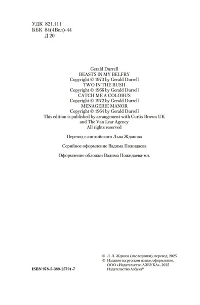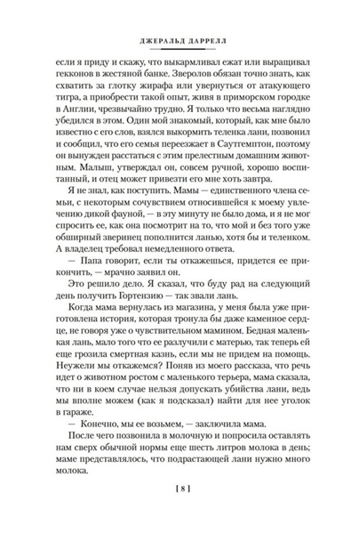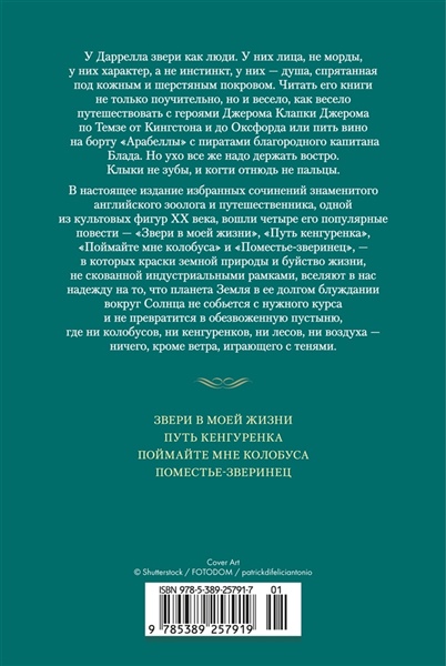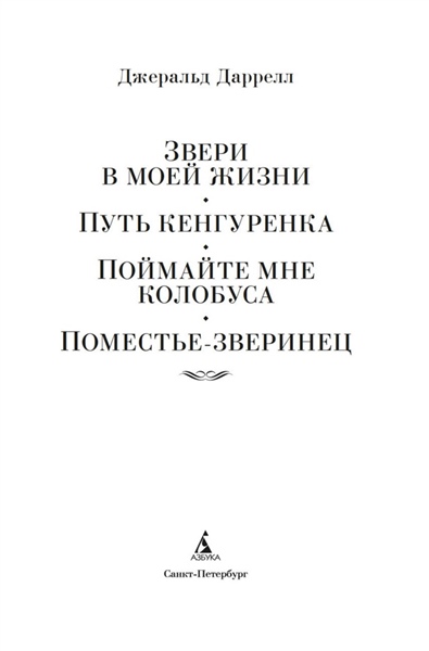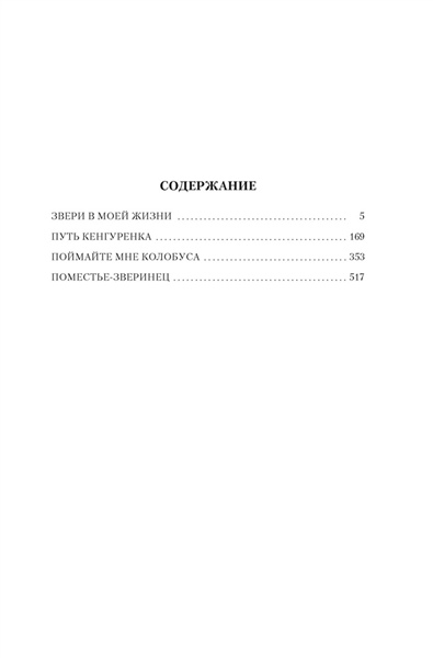 У Даррелла звери как люди. У них лица, не морды, у них характер, а не инстинкт, у них — душа, спрятанная под кожным и шерстяным покровом. Читать книги Даррелла не только поучительно, но и весело, как весело путешествовать с героями Джерома Клапки Джерома по Темзе от Кингстона и до Оксфорда или пить вино на борту «Арабеллы» с пиратами благородного капитана Блада. Но ухо все же надо держать востро. Клыки не зубы, и когти отнюдь не пальцы. В настоящее издание избранных сочинений знаменитого английского зоолога и путешественника, одной из культовых фигур ХХ века, вошли четыре его популярные повести — «Звери в моей жизни», «Путь кенгуренка», «Поймайте мне колобуса» и «Поместье-зверинец», — в которых краски земной природы и буйство жизни, не скованной индустриальными рамками, вселяют в нас надежду на то, что планета Земля в ее долгом блуждании вокруг Солнца не собьется с нужного курса и не превратится в обезвоженную пустыню, где ни колобусов, ни кенгуренков, ни лесов, ни воздуха — ничего, кроме ветра, играющего с тенями.