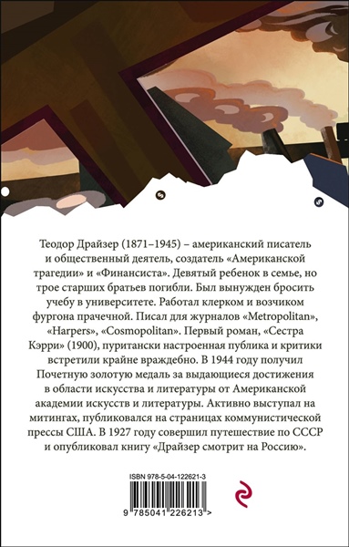 Теодор Драйзер (1871—1945) — американский писатель и общественный деятель, создатель «Американской трагедии» и «Финансиста». Девятый ребенок в семье, но трое старших братьев погибли. Был вынужден бросить учебу в университете. Работал клерком и возчиком фургона прачечной. Писал для журналов «Metropolitan», «Harpers», «Cosmopolitan». Первый роман «Сестра Кэрри» (1900) пуритански настроенная публика и критики встретили крайне враждебно. В 1944 году получил Почетную золотую медаль за выдающиеся достижения в области искусства и литературы от «Американской академии искусств и литературы». Активно выступал на митингах, публиковался на страницах коммунистической прессы США. В 1927 году совершил путешествие по СССР и опубликовал книгу «Драйзер смотрит на Россию».