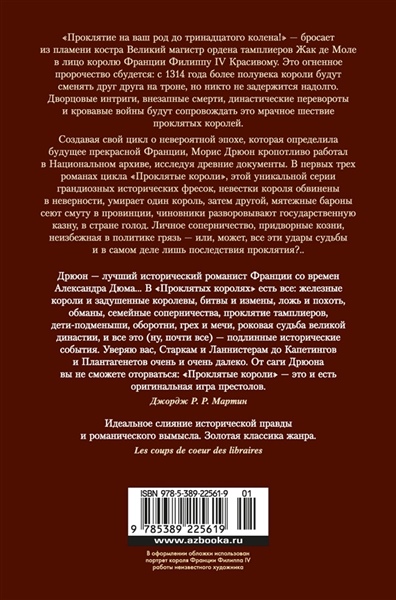 «Проклятие на ваш род до тринадцатого колена!» — бросает из пламени костра Великий магистр ордена тамплиеров Жак де Моле в лицо королю Франции Филиппу IV Красивому. Это огненное пророчество сбудется: с 1314 года более полувека короли будут сменять друг друга на троне, но никто не задержится надолго. Дворцовые интриги, внезапные смерти, династические перевороты и кровавые войны будут сопровождать это мрачное шествие проклятых королей. Создавая свой цикл о невероятной эпохе, которая определила будущее прекрасной Франции, Морис Дрюон кропотливо работал в Национальном архиве, исследуя древние документы. «Проклятые короли», эта уникальная серия грандиозных исторических фресок, впоследствии вдохновляла Джорджа Р. Р. Мартина, большого поклонника Дрюона, при работе над «Песнью льда и пламени». В первых трех романах цикла невестки короля обвинены в неверности, умирает один король, затем другой, мятежные бароны сеют смуту в провинции, чиновники разворовывают государственную казну, в стране голод. Личное соперничество, придворные козни, неизбежная в политике грязь — или, может, все эти удары судьбы и в самом деле лишь последствия проклятия?..