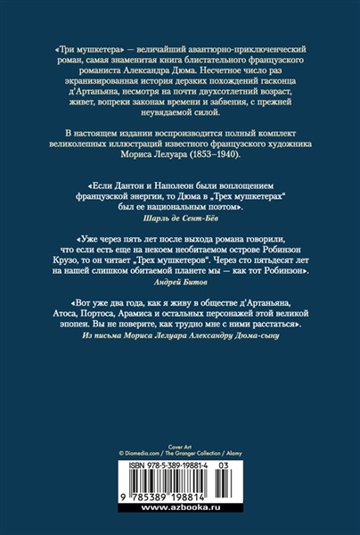 «Три мушкетера» — величайший авантюрно-приключенческий роман, самая знаменитая книга блистательного французского романиста Александра Дюма. Несчетное число раз экранизированная история дерзких похождений гасконца д’Артаньяна, несмотря на почти двухсотлетний возраст, живет, вопреки законам времени и забвения, с прежней неувядаемой силой. В настоящем издании воспроизводится полный комплект великолепных иллюстраций известного французского художника Мориса Лелуара (1853-1940).