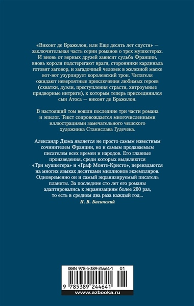 «Виконт де Бражелон, или Еще десять лет спустя» — заключительная часть серии романов о трех мушкетерах. И вновь от верных друзей зависит судьба Франции, вновь короля подстерегают враги, сторонники кардинала готовят заговор, и загадочный человекв железной маске вот-вот узурпирует королевский трон. Читателя ожидают невероятные приключения любимых героев (схватки, дуэли, преступления страсти, хитроумные придворные интриги), к которым теперь присоединился сын Атоса — виконт де Бражелон.