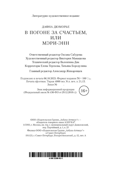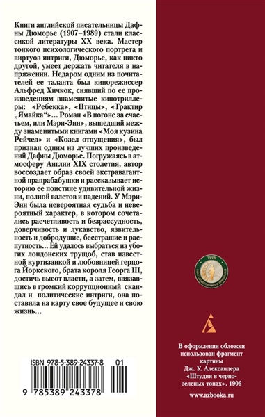 Книги английской писательницы Дафны Дюморье (1907–1989) стали классикой литературы XX века. Мастер тонкого психологического портрета и виртуоз интриги, Дюморье, как никто другой, умеет держать читателя в напряжении. Недаром одним из почитателей ее таланта был кинорежиссер Альфред Хичкок, снявший по ее произведениям знаменитые кинотриллеры: «Ребекка», «Птицы», «Трактир „Ямайка“»... Роман «В погоне за счастьем, или Мэри-Энн», вышедший между знаменитыми книгами «Моя кузина Рейчел» и «Козел отпущения», был признан одним из лучших произведений Дафны Дюморье. Погружаясь в атмосферу Англии XIX столетия, автор воссоздает образ своей экстравагантной прапрабабушки и рассказывает историю ее поистине удивительной жизни, полной взлетов и падений. У Мэри-Энн была невероятная судьба и невероятный характер, в котором сочетались расчетливость и безрассудность, доверчивость и лукавство, язвительность и добродушие, бесстрашие и распутность... Ей удалось выбраться из убогих лондонских трущоб, став известной куртизанкой и любовницей герцога Йоркского, брата короля Георга III, достичь высот власти, а затем, ввязавшись в громкий коррупционный скандал и политические интриги, она поставила на карту свое будущее и свою жизнь…
