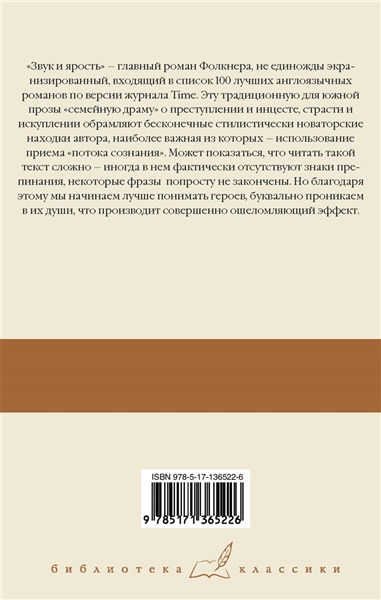 "Звук и ярость" – главный роман Фолкнера, не единожды экранизированный, входящий в список 100 лучших англоязычных романов по версии журнала Time. Эту традиционную для южной прозы "семейную драму" о преступлении и инцесте, страсти и искуплении обрамляют бесконечные стилистически новаторские находки автора, наиболее важная из которых – использование приема "потока сознания". Может показаться, что читать такой текст сложно – иногда в нем фактически отсутствуют знаки препинания, некоторые попросту фразы не закончены. Но благодаря этому мы начинаем лучше понимать героев, буквально проникаем в их души, что производит совершенно ошеломляющий эффект.