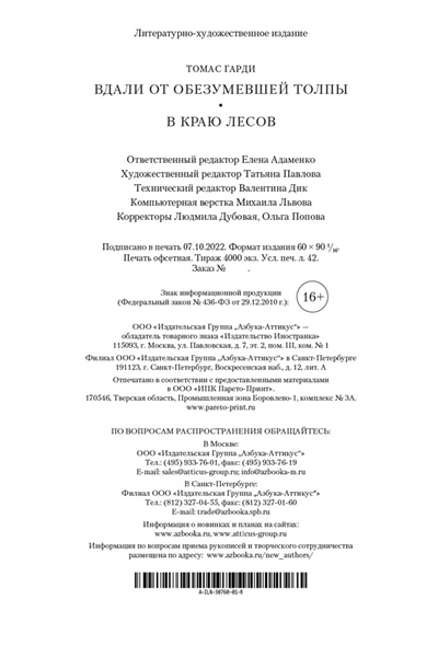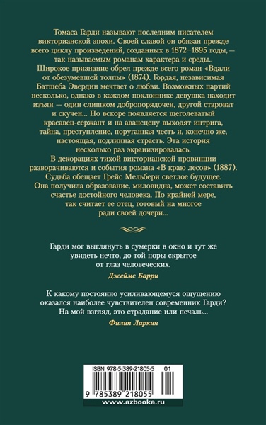 Томаса Гарди называют последним писателем Викторианской эпохи. Своей славой он обязан прежде всего циклу произведений, созданных в 1872–1895 годах, — так называемым романам характера и среды. Широкое признание обрел прежде всего роман «Вдали от обезумевшей толпы» (1874). Гордая, независимая Батшеба Эвердин мечтает о любви. Возможных партий несколько, однако в каждом поклоннике девушка находит изъян — один слишком добропорядочен, другой староват и скучен... Но вскоре появляется щеголеватый красавец-сержант, и на авансцену выходят интрига, тайна, преступление, поруганная честь и, конечно же, настоящая, подлинная страсть. Эта история несколько раз экранизировалась. В декорациях тихой викторианской провинции разворачиваются и события романа «В краю лесов» (1887). Судьба обещает Грейс Мельбери светлое будущее. Она получила образование, миловидна, может составить счастье достойного человека. По крайней мере, так считает ее отец, готовый на многое ради своей дочери...