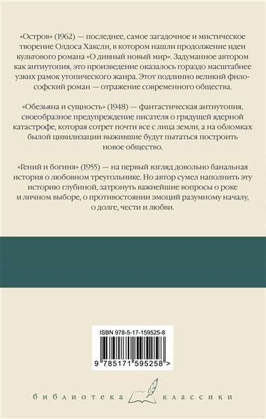 "Остров" (1962) — последнее, самое загадочное и мистическое творение Олдоса Хаксли, в котором нашли продолжение идеи культового романа "О дивный новый мир". Задуманное автором как антиутопия, это произведение оказалось гораздо масштабнее узких рамок утопического жанра. Этот подлинно великий философский роман — отражение современного общества. "Обезьяна и сущность" (1948) — фантастическая антиутопия, своеобразное предупреждение писателя о грядущей ядерной катастрофе, которая сотрет почти все с лица земли, а на обломках былой цивилизации выжившие будут пытаться построить новое общество. "Гений и богиня" (1955) — на первый взгляд довольно банальная история о любовном треугольнике. Но автор сумел наполнить эту историю глубиной, затронуть важнейшие вопросы о роке и личном выборе, о противостоянии эмоций разумному началу, о долге, чести и любви.