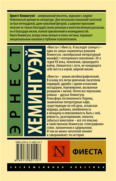 «Фиеста» («Фиеста. И восходит солнце») — один из самых знаменитых романов Хемингуэя, своеобразный литературный манифест «потерянного поколения» 20-х годов XX века, поколения, прошедшего войну, сбившегося с пути, не находящего себе места в новой, мирной жизни. «Фиеста» — роман автобиографический. В основу его легли увлечение писателем корридой, дружба с одним испанским матадором, переживания, вызванные разрывом с женой. Почти все персонажи романы — друзья Хемингуэя. Атмосфера послевоенного Парижа, знаменитые литературные кафе, существующие по сей день, испанская коррида, рыбалка, влюбленность в женщину и невозможность быть с ней, ревность, разочарования, попытка забыться алкоголем — все это описано в свойственном Хемингуэю «телеграфном» стиле, лаконичном и сдержанном. И тем не менее читателей пленяет и завораживает эта история.