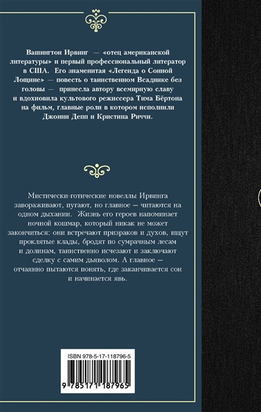 Мистически-готические новеллы Ирвинга завораживают, пугают, но главное — читаются на одном дыхании. Жизнь его героев напоминает ночной кошмар, который никак не может закончиться: они встречают призраков и духов, ищут проклятые клады, бродят по сумрачным лесам и долинам, таинственно исчезают и заключают сделку с самим дьяволом. А главное — отчаянно пытаются понять, где заканчивается сон и начинается явь.