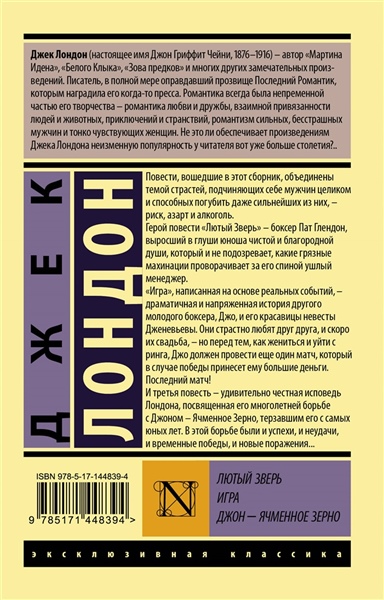 Повести, вошедшие в этот сборник, объединены темой страстей, подчиняющих себе мужчин целиком и способных погубить даже сильнейших из них – риск, азарт и алкоголь. Герой повести "Лютый Зверь" – боксер Пат Глендон, выросший в глуши юноша чистой и благородной души, который и не подозревает, какие грязные махинации проворачивает за его спиной ушлый менеджер. "Игра", написанная на основе реальных событий, – драматичная и напряженная история другого молодого боксера Джо и его красавицы невесты Дженевьевы. Они страстно любят друг друга, и скоро их свадьба, – но перед тем, как жениться и уйти с ринга, Джо должен провести еще один матч, который, в случае победы, принесет ему большие деньги. Последний матч! И третья повесть – удивительно честная исповедь Лондона, посвященная его многолетней борьбе с Джоном – Ячменное Зерно, терзавшим его с самых юных лет. В этой борьбе были и успехи, и неудачи, и временные победы, и новые поражения...