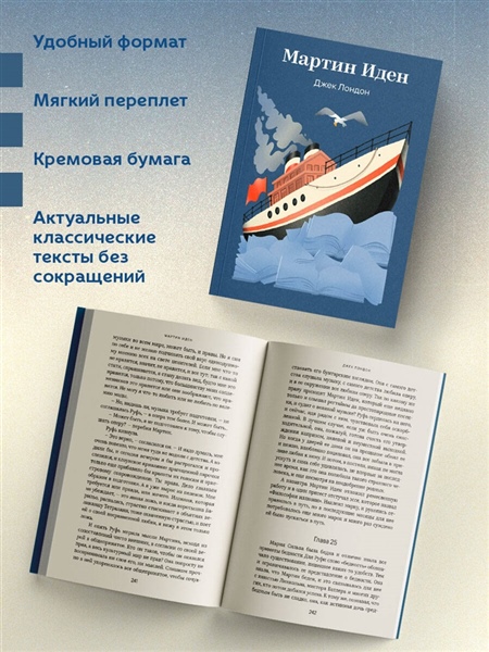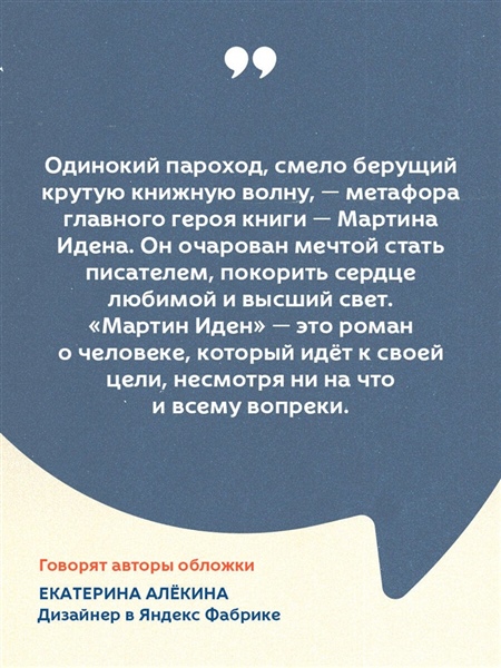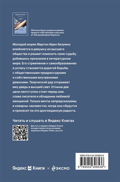 Молодой моряк Мартин Иден безумно влюбляется в девушку из высшего общества и решает изменить свою судьбу, добившись признания в литературном мире. Его стремление к самообразованию и успеху становится дорогой борьбы с общественными предрассудками и собственными внутренними демонами. Творческий дар открывает ему дверь в высший свет.Отныне две цели неотступно стоят перед ним: слава писателя и обладание любимой женщиной. Только мечты непредсказуемы и коварны: неизвестно, когда они сбудутся и принесет ли это долгожданную радость. Роман о жажде свободы, личном росте и о цене, которую платит человек за свою мечту. "100 из 100. Дизайнерская серия" - это коллаборация ЭКСМО и Яндекс Книг, родившаяся из проекта «100 обложек от 100 дизайнеров Яндекса». Актуальность классических текстов подчеркивается разнообразием художественных приемов в оформлении. Удобный формат. Мягкий переплет. Кремовая бумага.