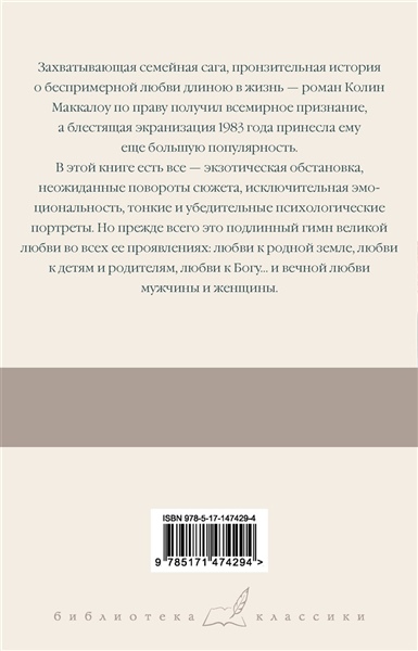 Захватывающая семейная сага, пронзительная история о беспримерной любви длиною в жизнь – роман Колин Маккалоу по праву получил всемирное признание, а блестящая экранизация 1983 года принесла ему еще большую популярность. В этой книге есть все – экзотическая обстановка, неожиданные повороты сюжета, исключительная эмоциональность, тонкие и убедительные психологические портреты. Но прежде всего это подлинный гимн великой любви, во всех ее проявлениях: любви к родной земле, любви к детям и родителям, любви к Богу… и вечной любви мужчины и женщины.