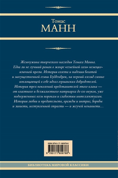 Жемчужина творческого наследия Томаса Манна. Едва ли не лучший роман в жанре "семейной саги" немецкоязычной прозы. История взлета и падения богатой и могущественной семьи Будденброк, на первый взгляд словно воплощающей в себе идеал германских добродетелей. История трех поколений представителей этого клана — от властного и безжалостного патриарха до его внуков, уже подверженных всем порокам и слабостям интеллектуалов. История любви и предательств, вражды и интриг, борьбы и зависти, исступленной страсти — и жгучей ненависти…